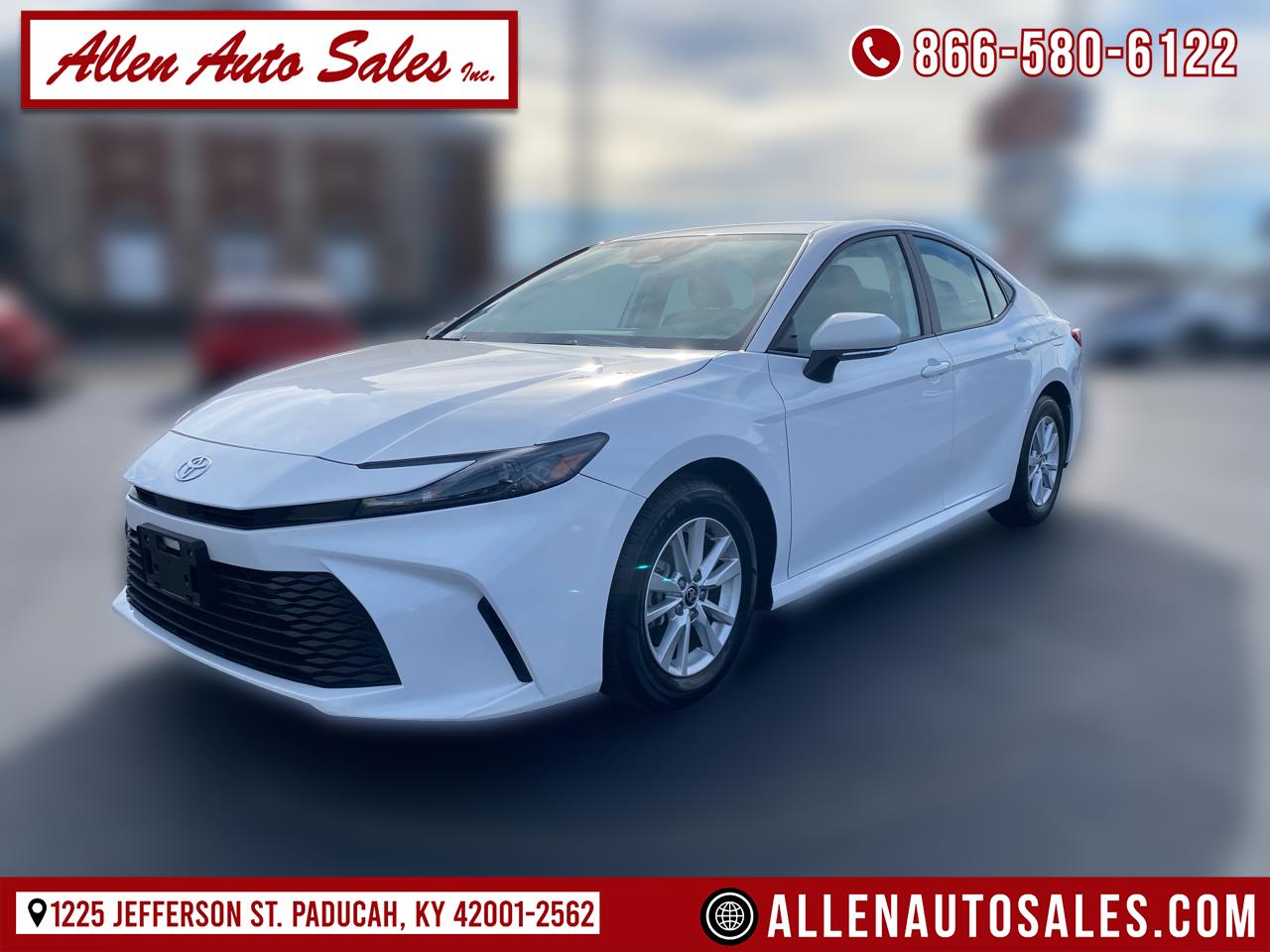 Cruise around town in style and efficiency with this sleek White 2025 Toyota Camry hybrid. Boasting a powerful yet eco-friendly 2.5L 4-Cylinder engine, this Camry offers a smooth ride with its Electronically Controlled CVT transmission. With the innovative Engine Auto Stop-Start feature, you'll save fuel while reducing emissions, making every drive a responsible choice. Enjoy a comfortable and connected experience with dual-zone automatic air conditioning and a user-friendly infotainment system complete with a safety connect tracker system for added peace of mind. The modern design of this Camry is not only eye-catching but also practical, featuring a spacious trunk, durable steel spare wheel, and efficient LED headlights. Safety is a top priority with features like Blind Spot Monitor and Collision Mitigation technology. Whether you're commuting to work or embarking on a road trip, this 2025 Toyota Camry is the perfect blend of performance, comfort, and technology. Drive smarter, drive greener, drive the future in this hybrid beauty.At Allen Auto Sales...You'll be proud of what you got! With over 60 years in downtown Paducah, Kentucky, Allen Auto Sales is the undisputed champion of customer satisfaction. We offer an extensive inventory of quality used vehicles, backed by our 30 day, 1,000 mile warranty, and available financing that fits your needs.